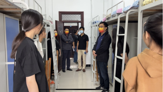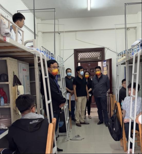 每到一个宿舍,校领导们仔细查看疫情防控措施和各种安全措施是否落实到位;关切地询问同学们生活情况,是否适应大学新生活,有无困难需要解决;鼓励大家好好学习,做好学习规划、职业规划等;希望大家未来四年能和学校互相促进、共同成长,共同创造美好的未来。