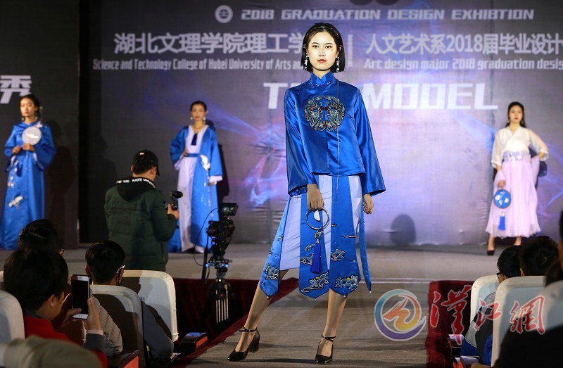 (襄阳晚报)11月22日,大学生模特展示KY.COM学生设计的服装。当日,该学院人文艺术系举行2018届毕业设计作品展,13位优秀毕业生设计的服装在T台上展示。