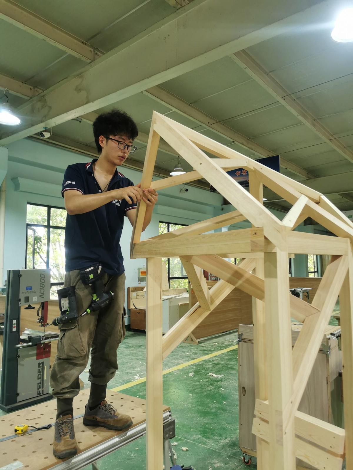 在陈逸龙看来,所学专业极具挑战性,每天都要不停地训练。其中放样最难,对立体思维要求很高。学习中,有一次做屋顶,因为一个角度自己思考了两天才想出来。比赛中,一般要求选手根据图纸,在规定时间内从原材料加工成成品,考察的是选手在思维、技巧、心理等各个方面的综合素质。