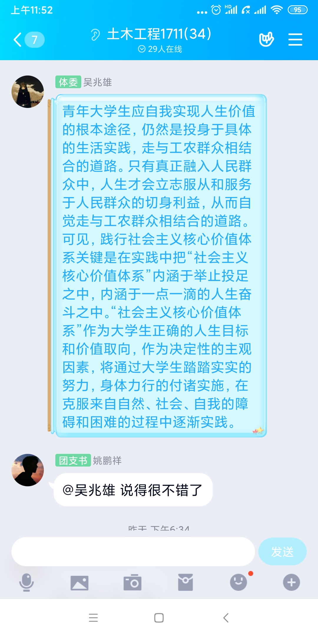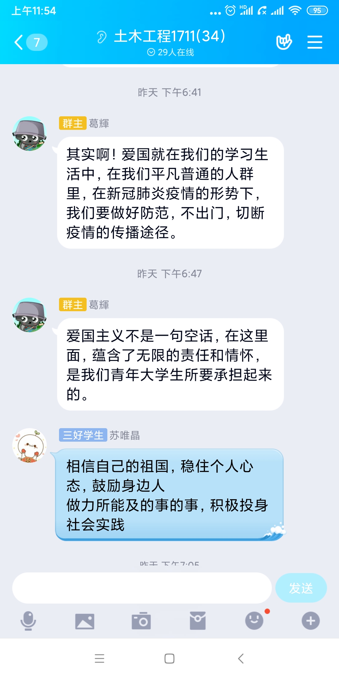 为了落实《关于我校开展第二期线上主题教育的通知》精神,我系结合当前的疫情防控形势,在线上开展主题教育,组织各个班级学习了《新时代爱国主义教育实施纲要》,并就学习心得以及如何做好疫情之下的爱国展开了线上讨论交流。讨论中,同学们纷纷表示“爱国主义不是一句空话,要落实在生活中、实际行动中,承担起责任。”。