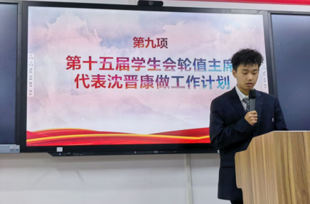 随后,新任学生会轮值主席代表沈晋康做工作计划,提出四点规划:协调各部门职能、提高业务能力、发挥模范作用、打造特色活动。