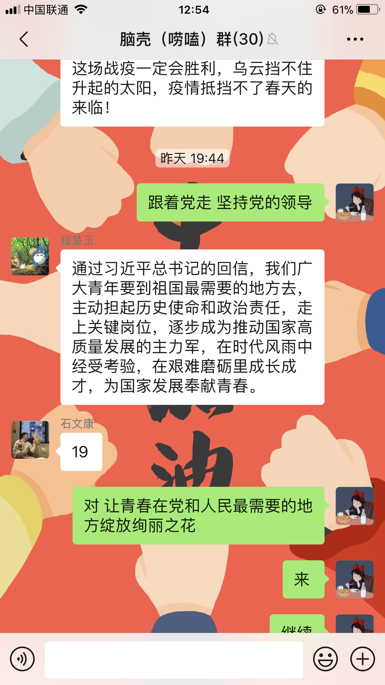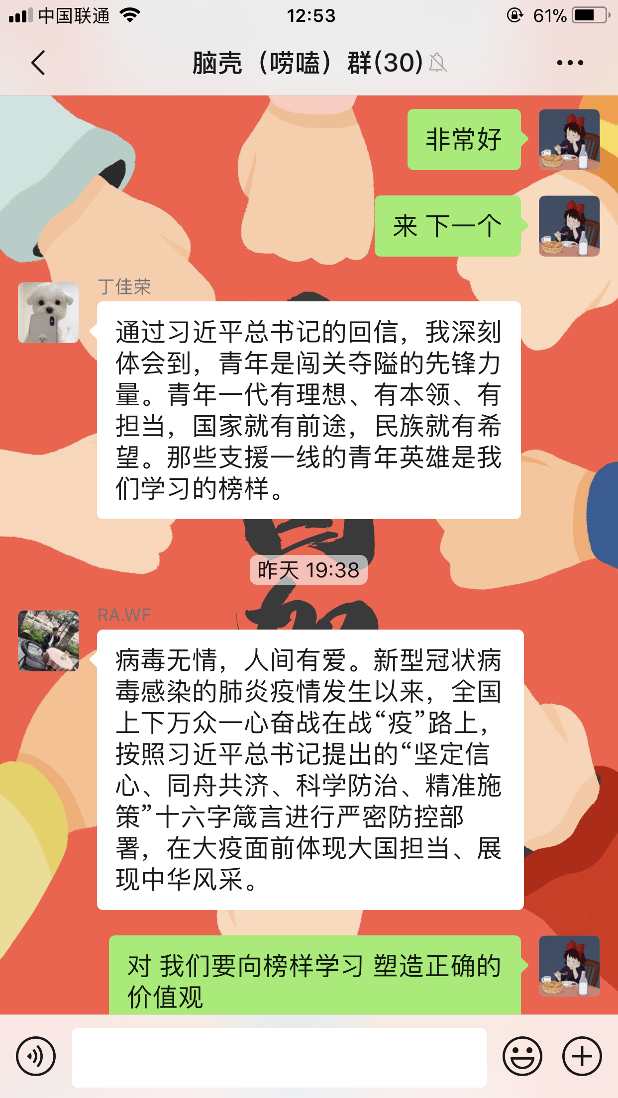 “通过习近平总书记的回信,我深刻体会到,青年是闯关夺隘的先锋力量。青年一代有理想、有本领、有担当,国家就有前途,民族就有希望。那些支援一线的青年英雄是我们学习的榜样。”---------党员丁佳荣说。
