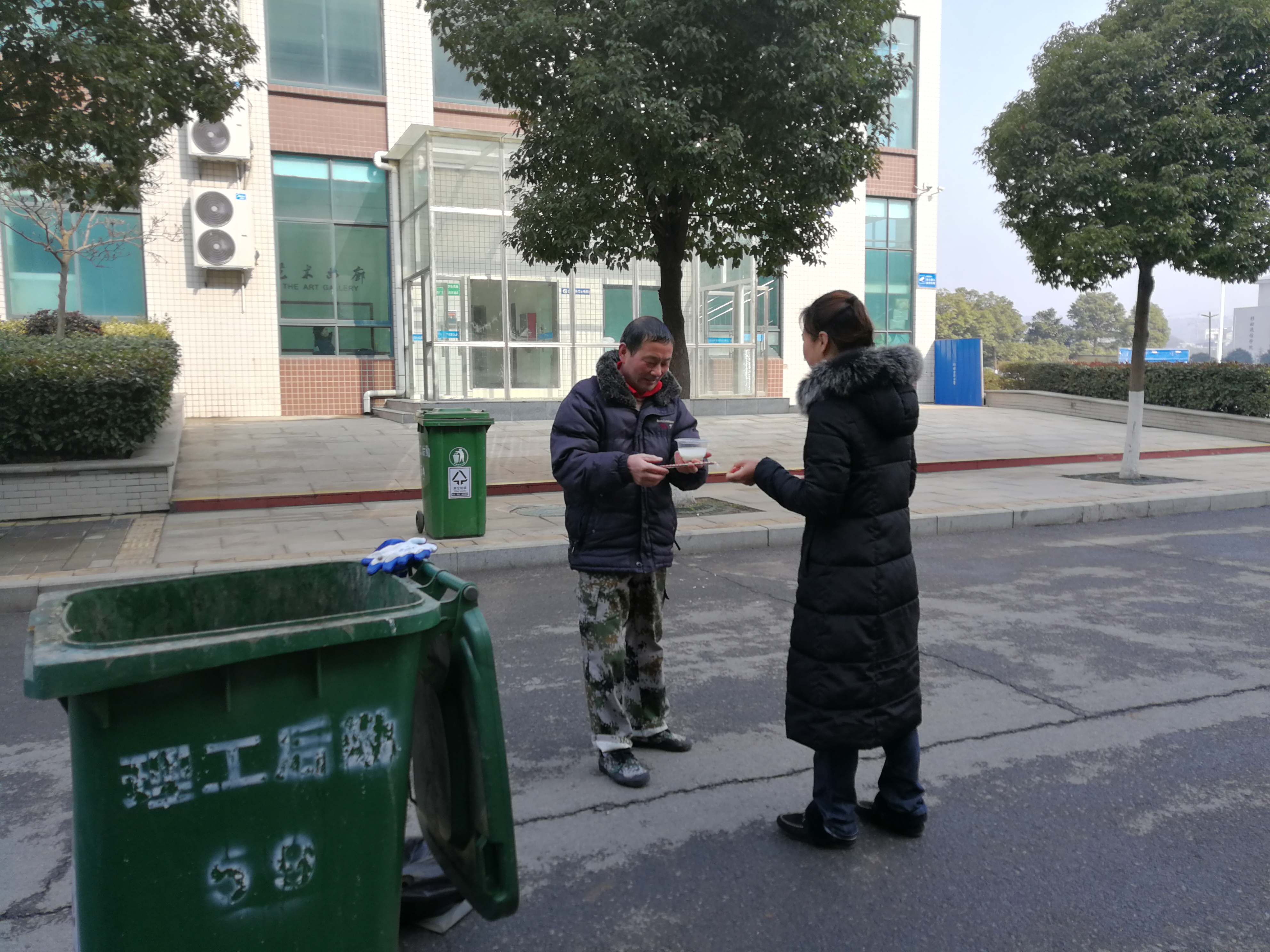 上午,支部买来了汤圆、米酒,并将煮好的汤圆一碗碗送到各楼楼管及清洁工的手中。今天天气还是比较寒冷,但是能让工作在一线的楼管师傅们在这寒冷的天气里吃上甜甜的汤圆,大家心里都是暖暖的。