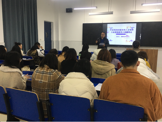 (外语系王君璞)4月1日下午,外语系在8教317会议室召开了2020版本科人才培养方案课程教学大纲解读会。会议由外语系副主任王婷婷主持,教务处胡阳处长主讲。外语系全体教师参会。